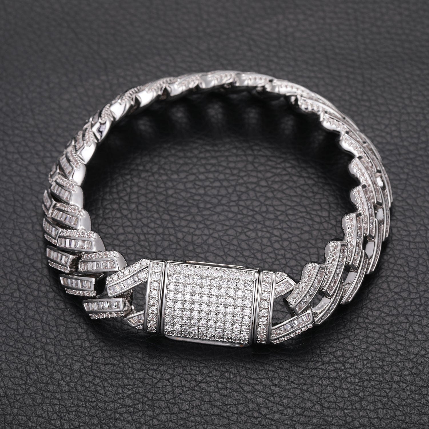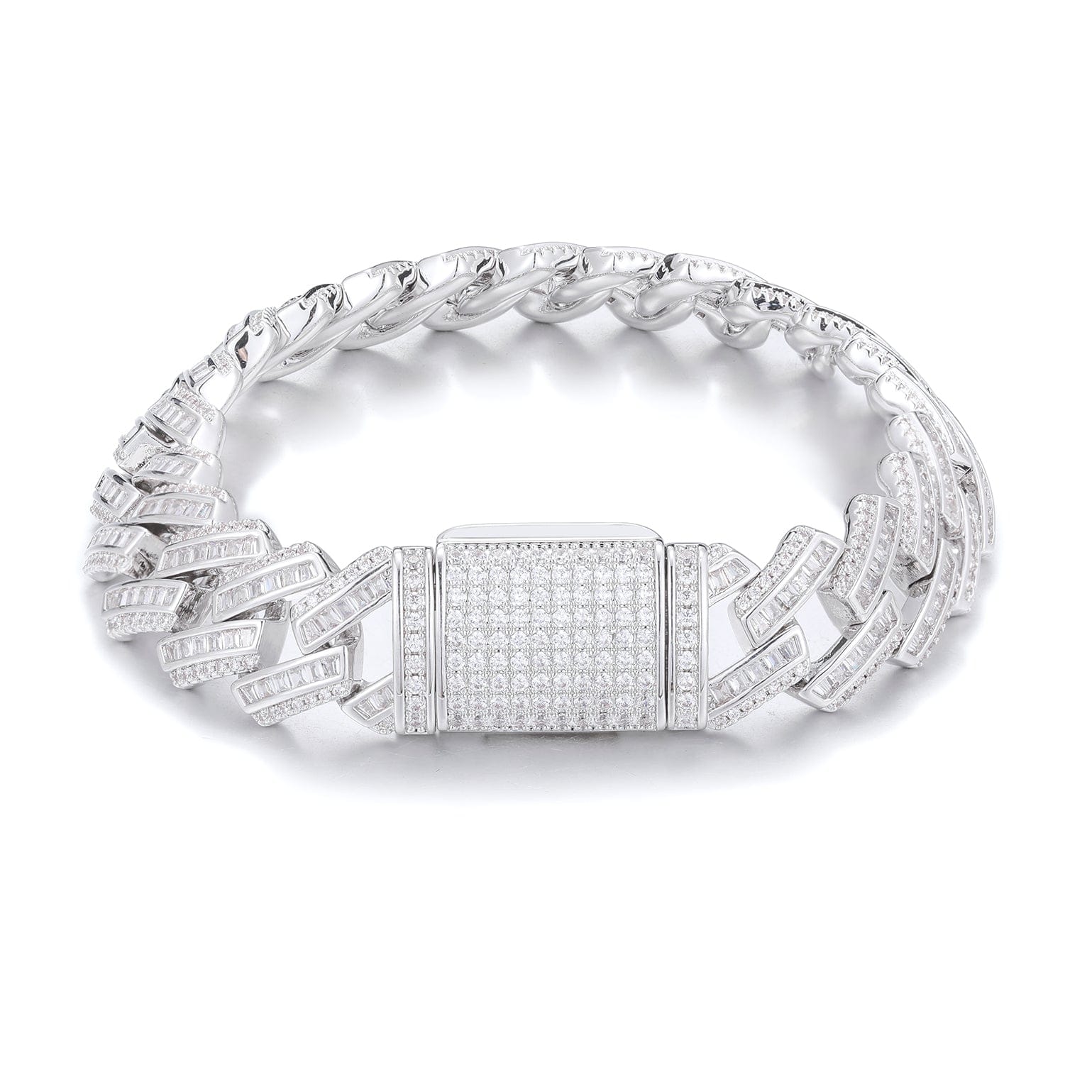 The Nocta Vince Helix 16MM Baguette Cuban Bracelet brings the same luxury detailing to your wrist, featuring 16MM baguette-cut links that shine with crisp, high-end brilliance. Each link blends long baguette stones with micro pavé highlights, giving the bracelet a sharp, modern sparkle.
