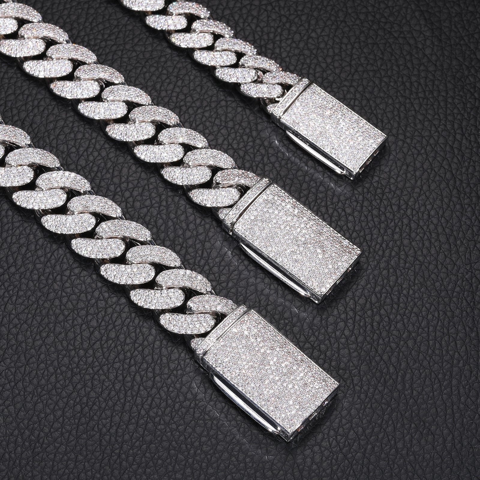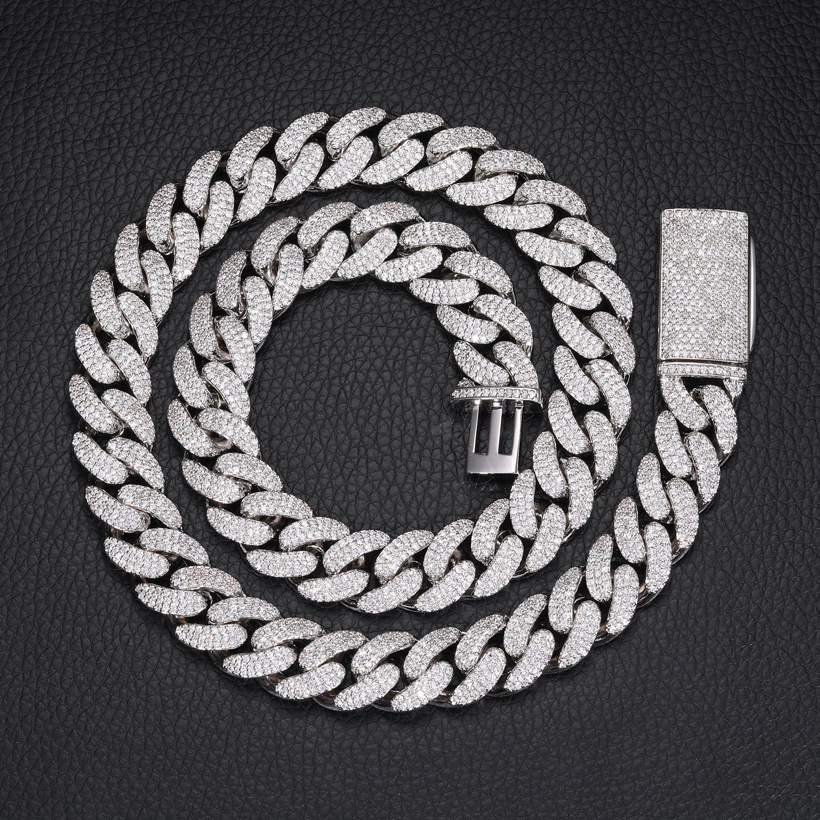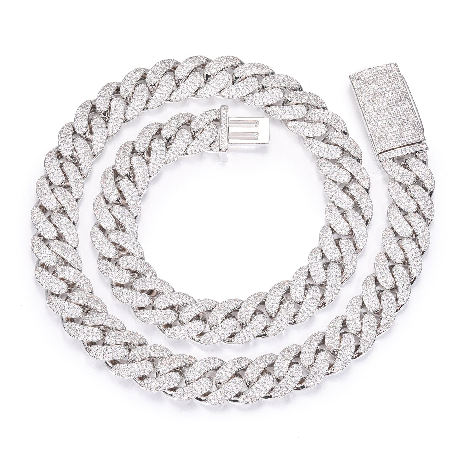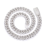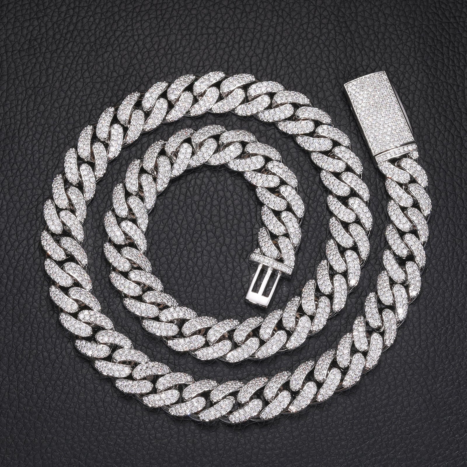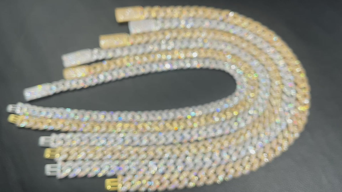 Available in Gold and Silver, this chain features a thick 12MM or 14MM profile with every link covered in handset pave stones for an insane shine from every angle.