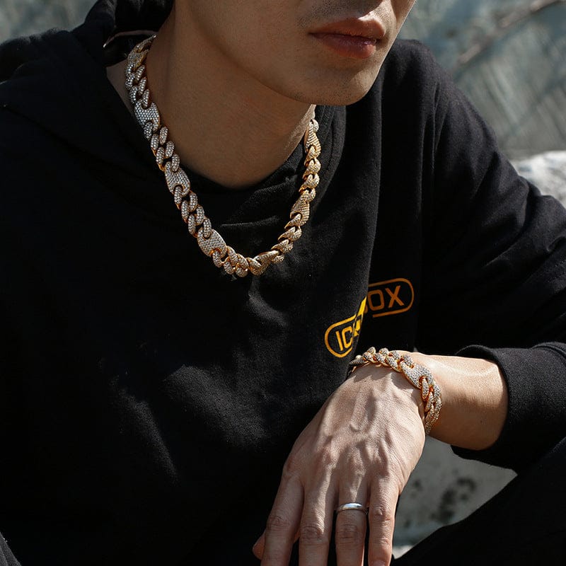 Turn up your drip with the Nocta Vince 15MM Arcline Miami Cuban Chain — a bold, ultra-polished statement piece built for maximum shine. Featuring rounded links and a fully iced surface, this chain brings that clean, heavyweight look made to stand out with every fit. Whether worn solo or stacked, it delivers luxury, durability, and shine that demands attention.