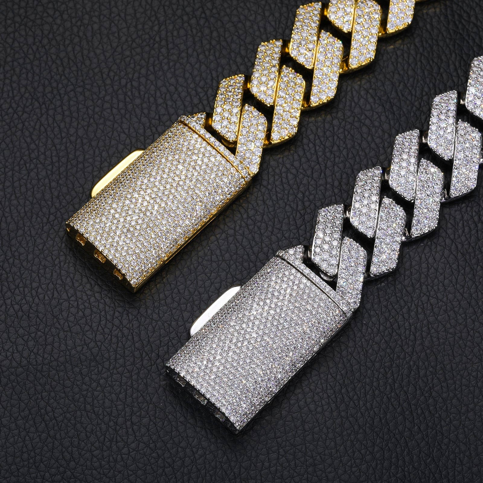 The Nocta Vince 22MM Opal Pavé Cuban Chain delivers big shine with a bold, heavyweight profile. Each oversized 22MM link is fully covered in micro pavé-set CZ stones, creating an intense, uniform sparkle across the entire chain. With its polished gold and silver finishes, this piece offers luxury-level brilliance and a clean, modern look.